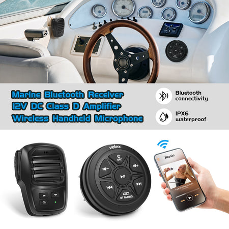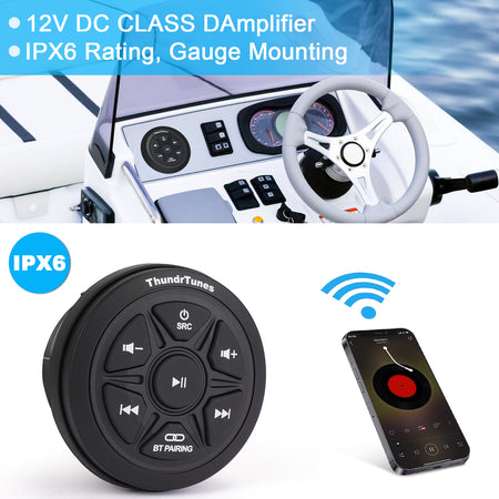 IPx5 Marine Bluetooth Stereo 10.8-15.6V DC input, 10 amp 3AG fuse MP3/WMA playback Bluetooth Audio Streaming 2x90W built in Class D amplifier Wireless handheld...