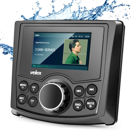 IPx5 Marine Bluetooth Stereo 10.8-15.6V DC input, 6 amp 3AG fuse 2.7" Full Viewing Angle TFT Color Display MP3/WMA playback Bluetooth Audio Streaming DAB+/AM/FM...