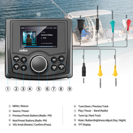 IPx5 Marine Bluetooth Stereo 10.8-15.6V DC input, 10 amp 3AG fuse 2.7" IPS TFT Display, full viewing angle VIDEO/MP3/WMA playback 3 Audio Zone settings...